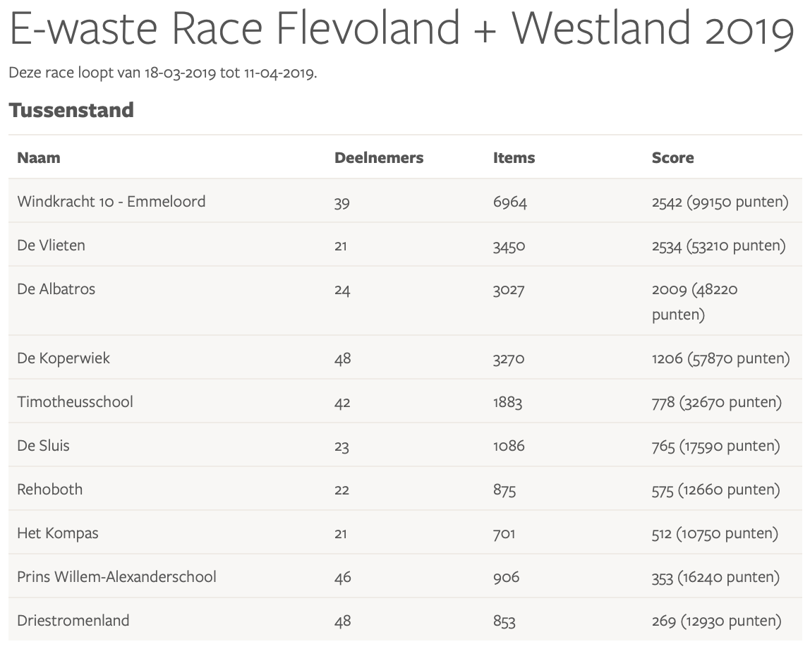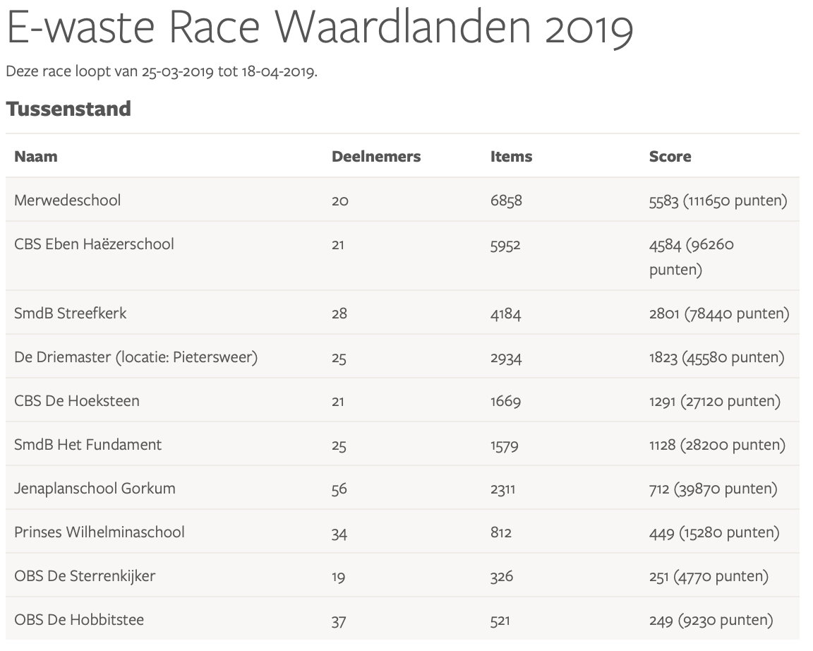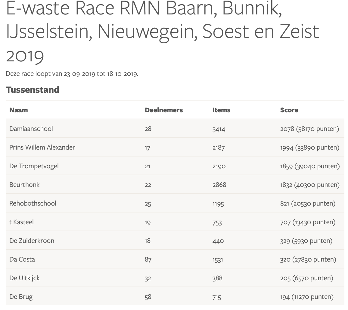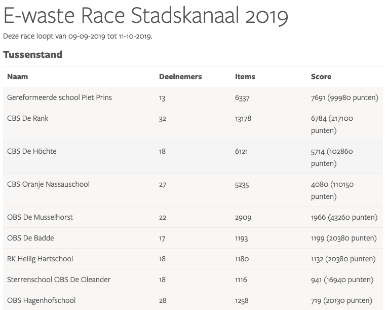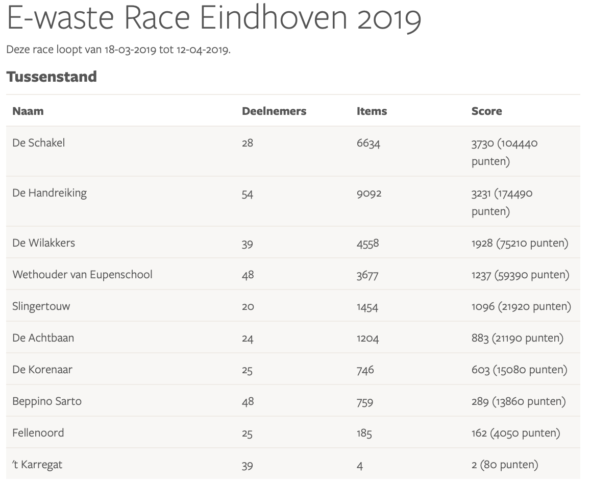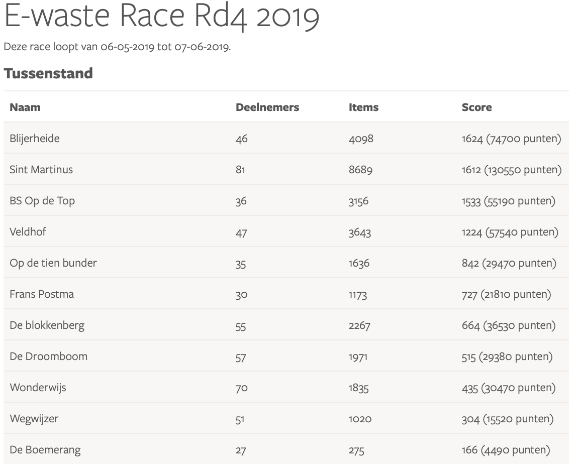 Resultaten E-waste Race 2019