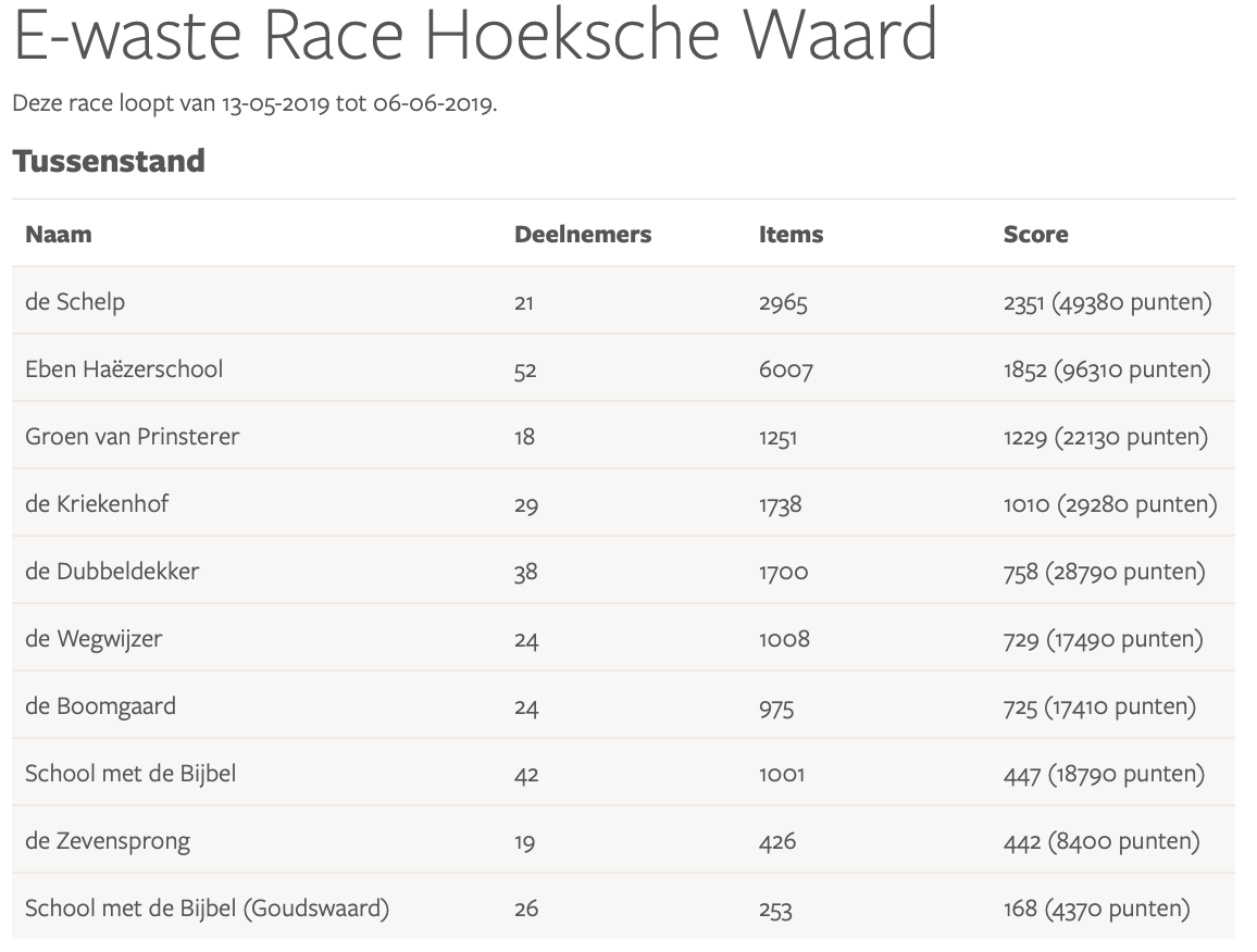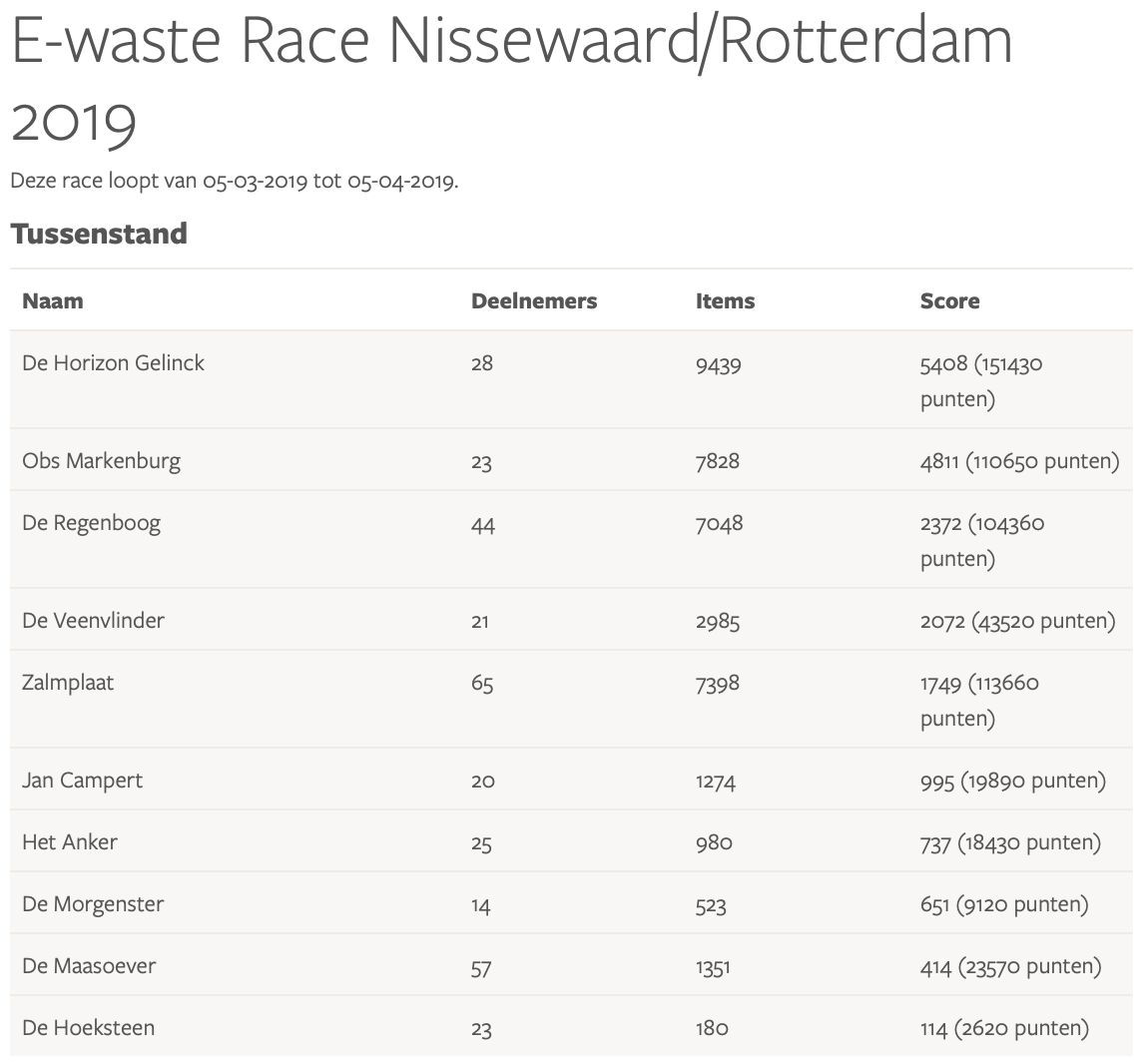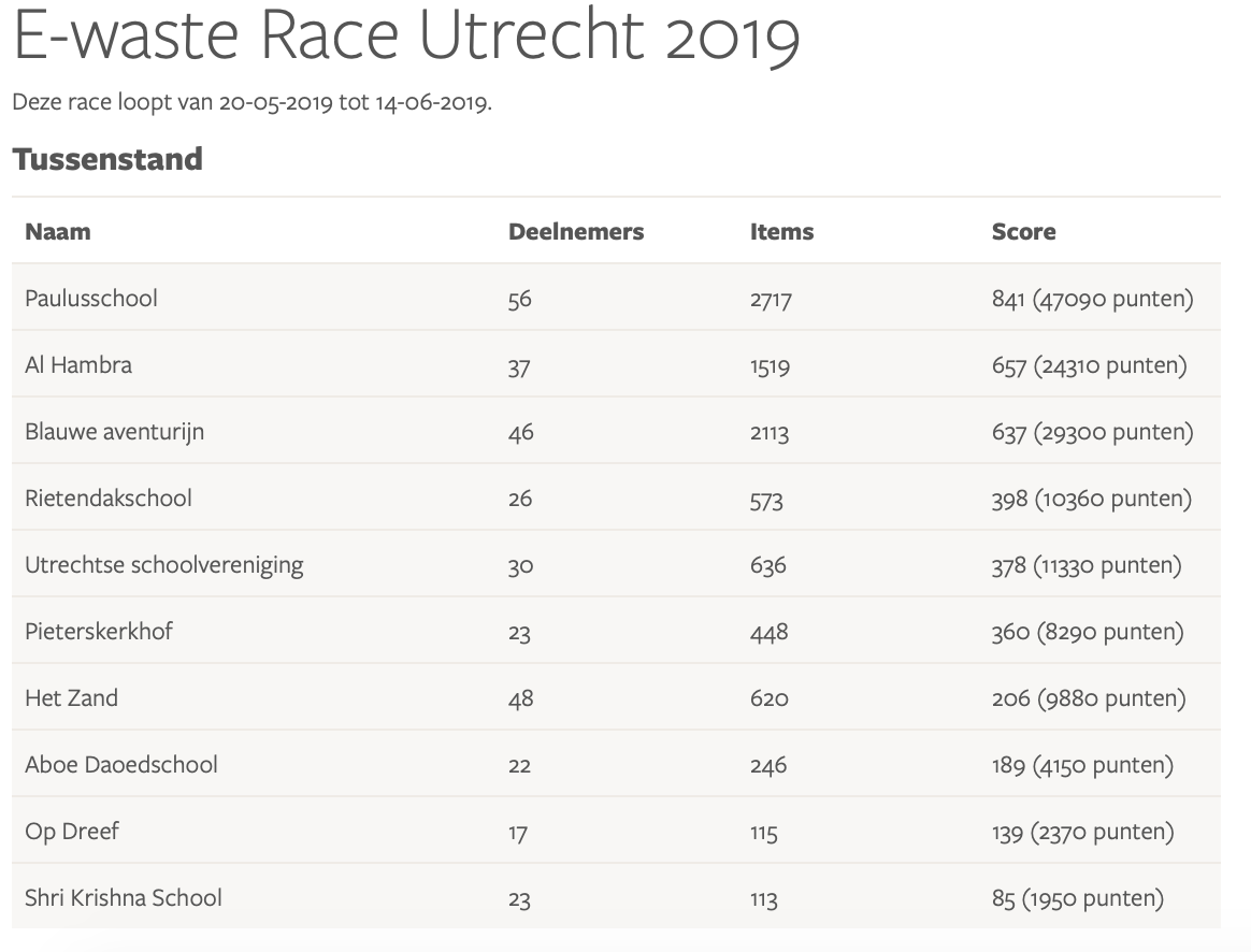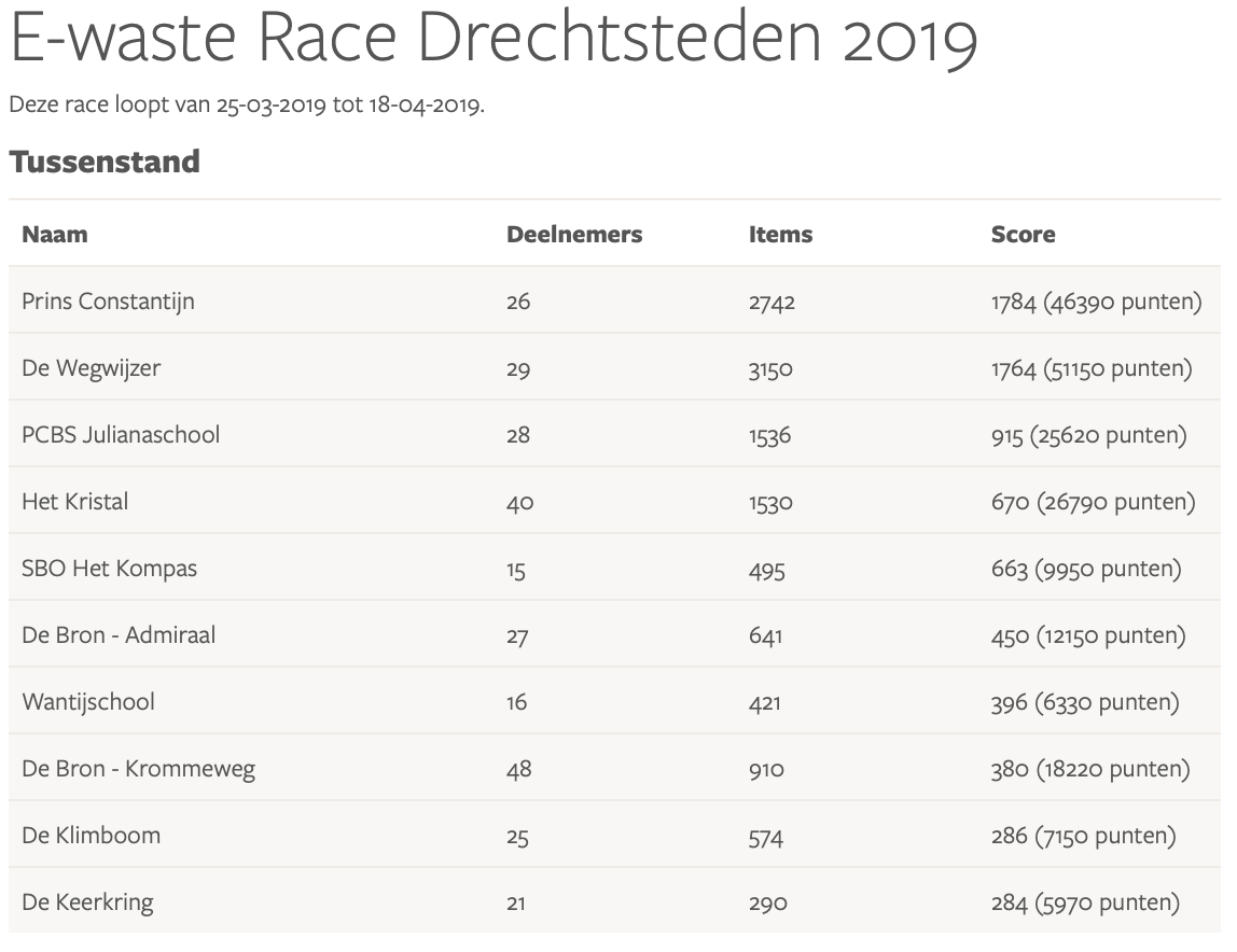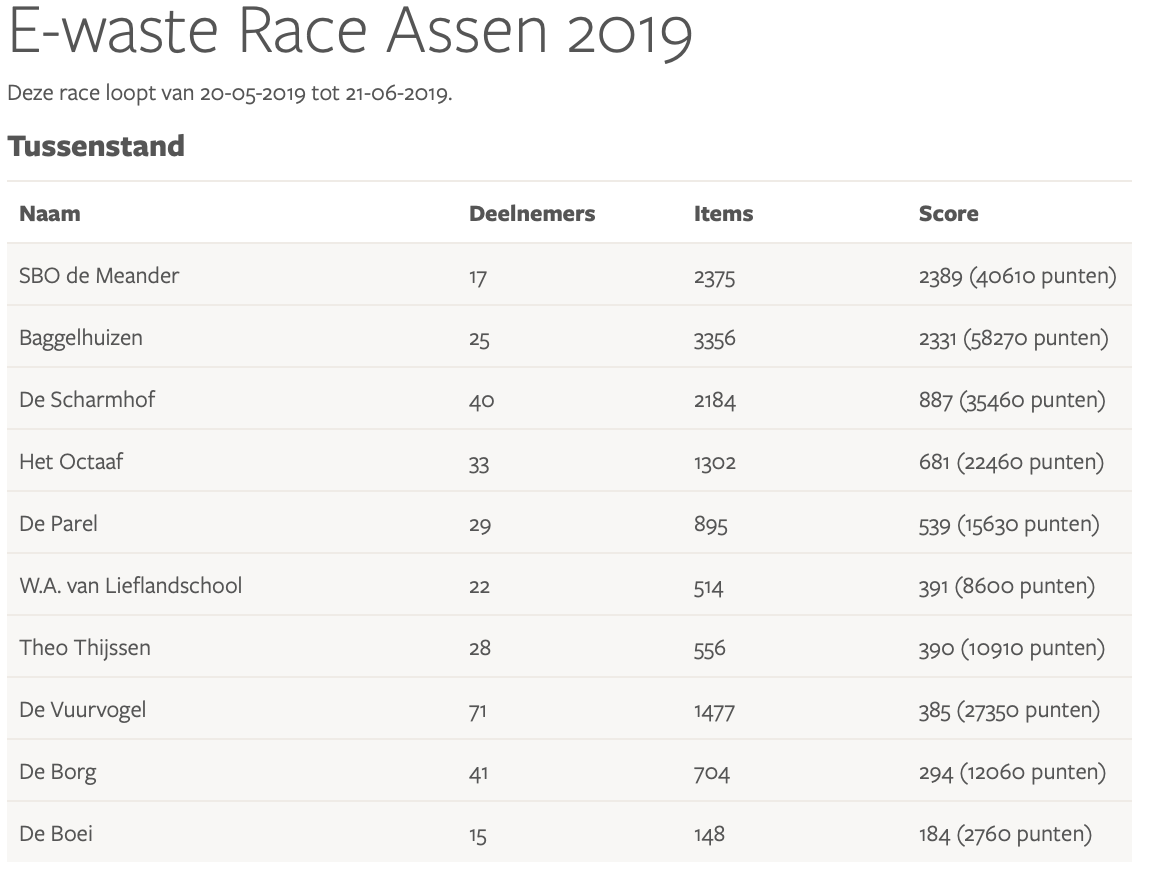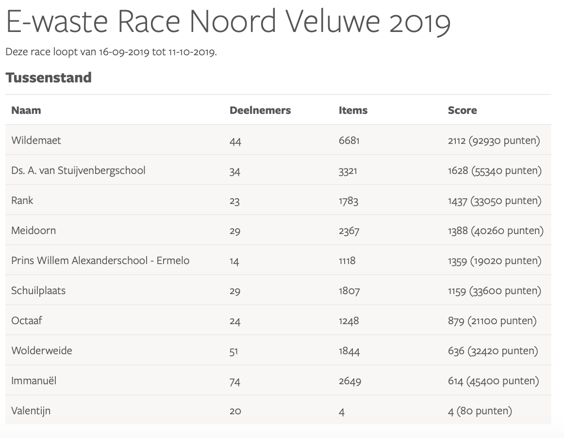 Resultaten E-waste Race 2019