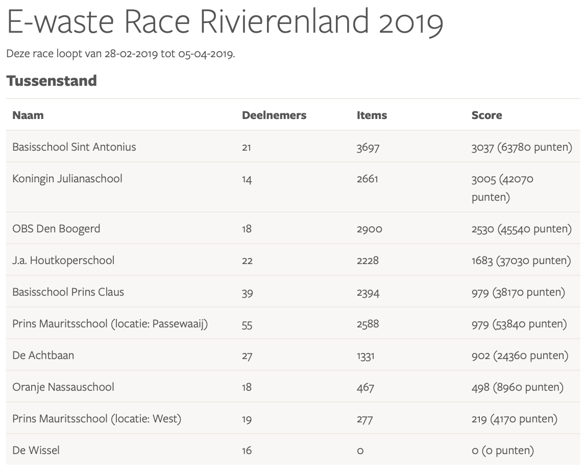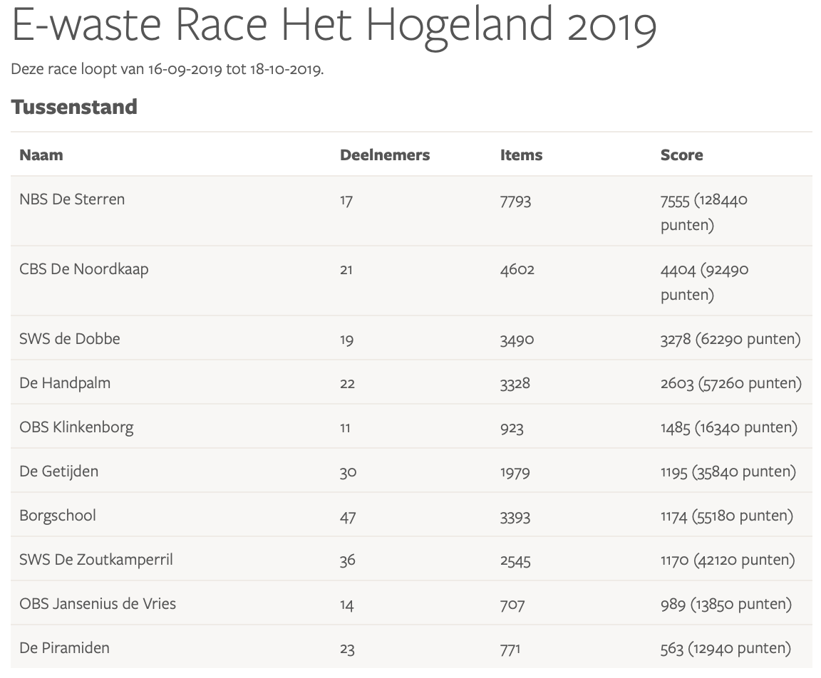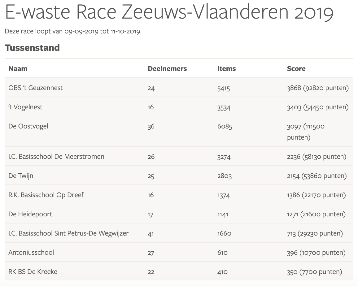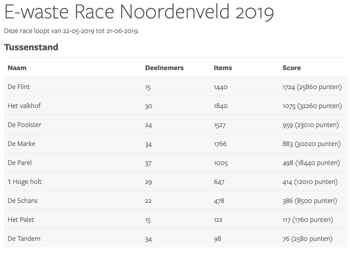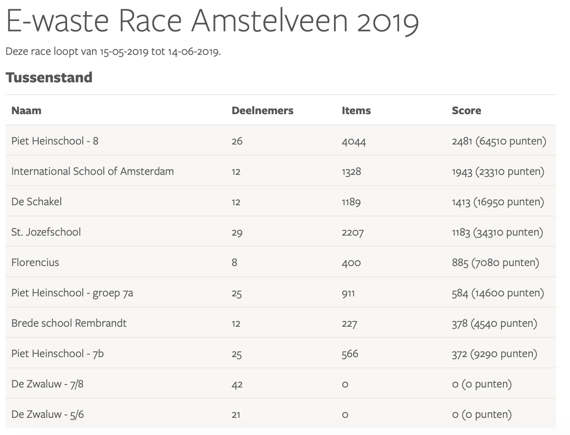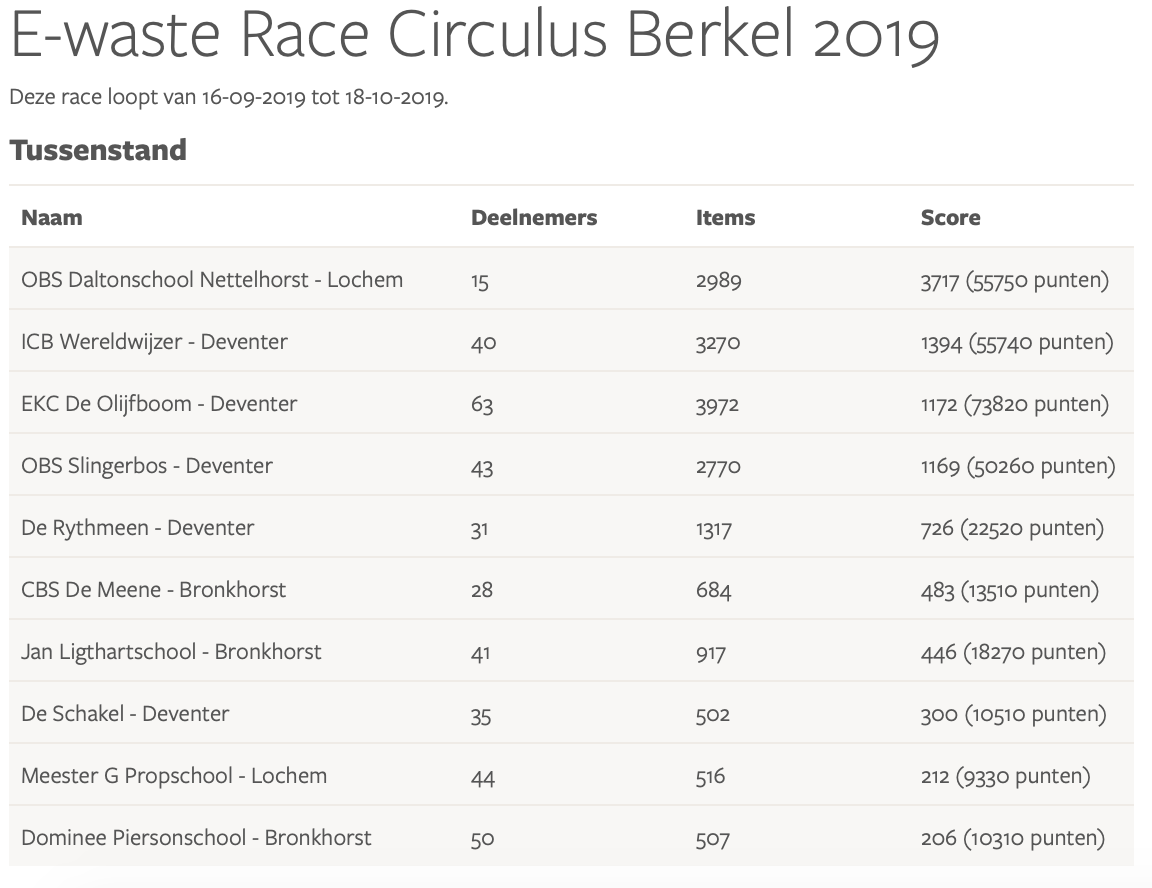 Resultaten E-waste Race 2019
