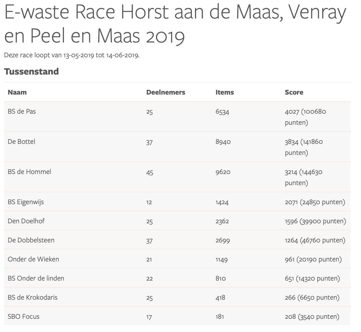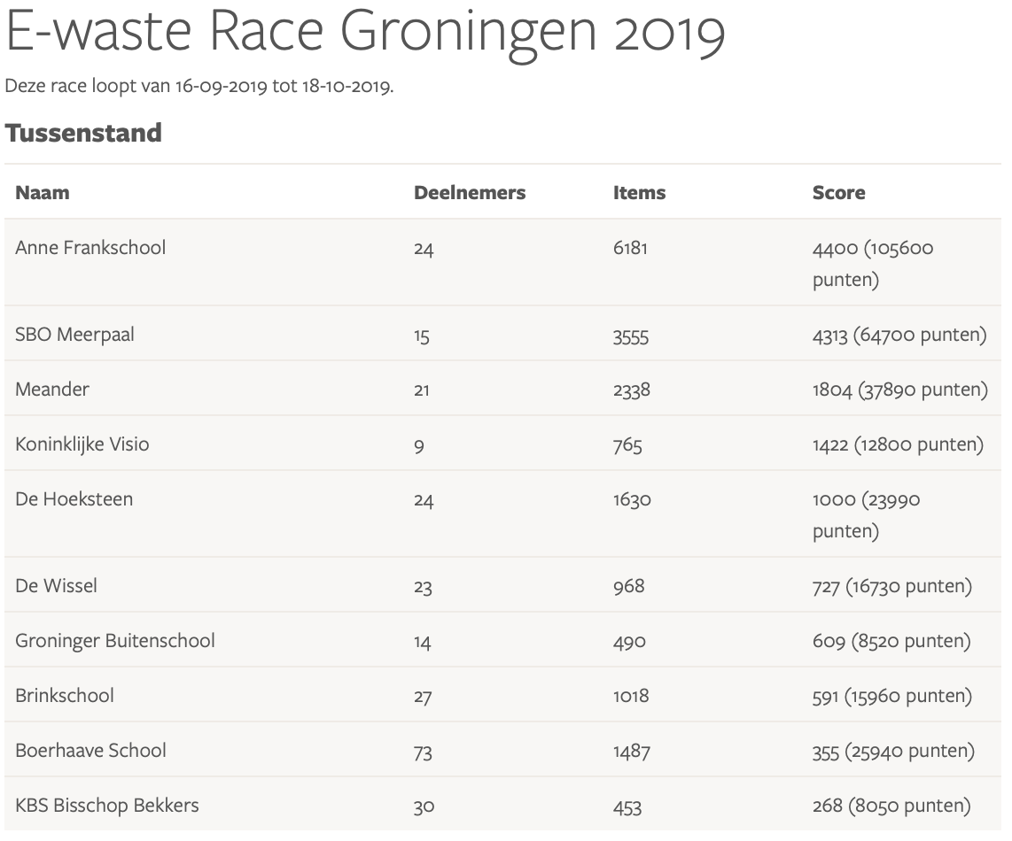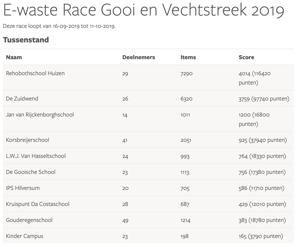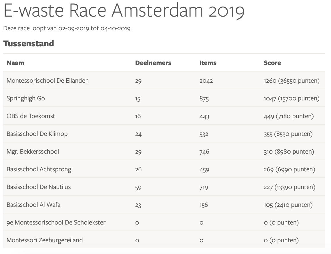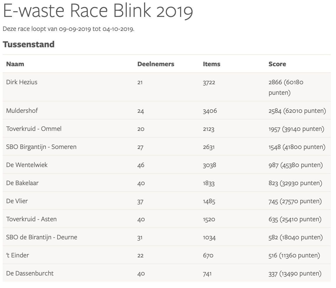 Resultaten E-waste Race 2019